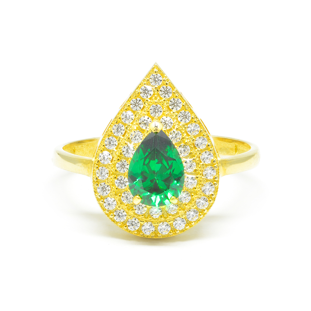 Δαχτυλίδι μονόπετρο από κίτρινο χρυσο Κ14 σε μοναδικά αριστοκρατικό σχεδιασμό σχεδιασμό με μεγάλο πράσινο zirgon σε pear cut-σχήμα σταγόνας κι εξαιρετικές λεπτομέρειες στο πλάι από λαμπερά zirgons . Ένα συμβολικό κόσμημα ιδανικό για ξεχωριστές και διαχρονικές εμφανίσεις. Wedding collection