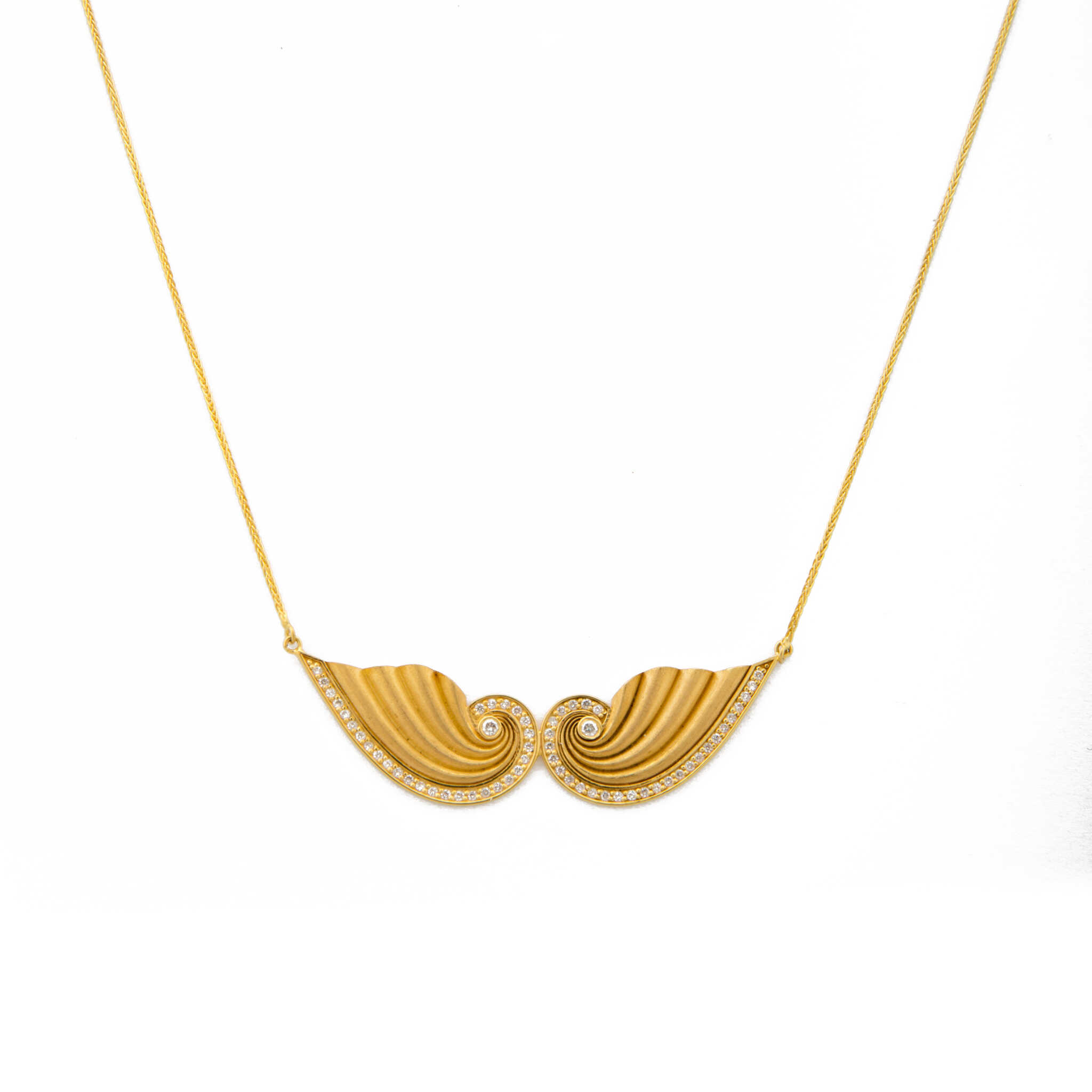 Κολλιέ-περιδέραιο από κίτρινο χρυσό Κ18 ματ αρχαιοελληνικής έμπνευσης και σχεδιασμό διαχρονικής αισθητικής και διαμάντια κοπής brilliant . Ιδανικό για βραδινές all time classic εμφανίσεις. Brilliants total 0.33ct.