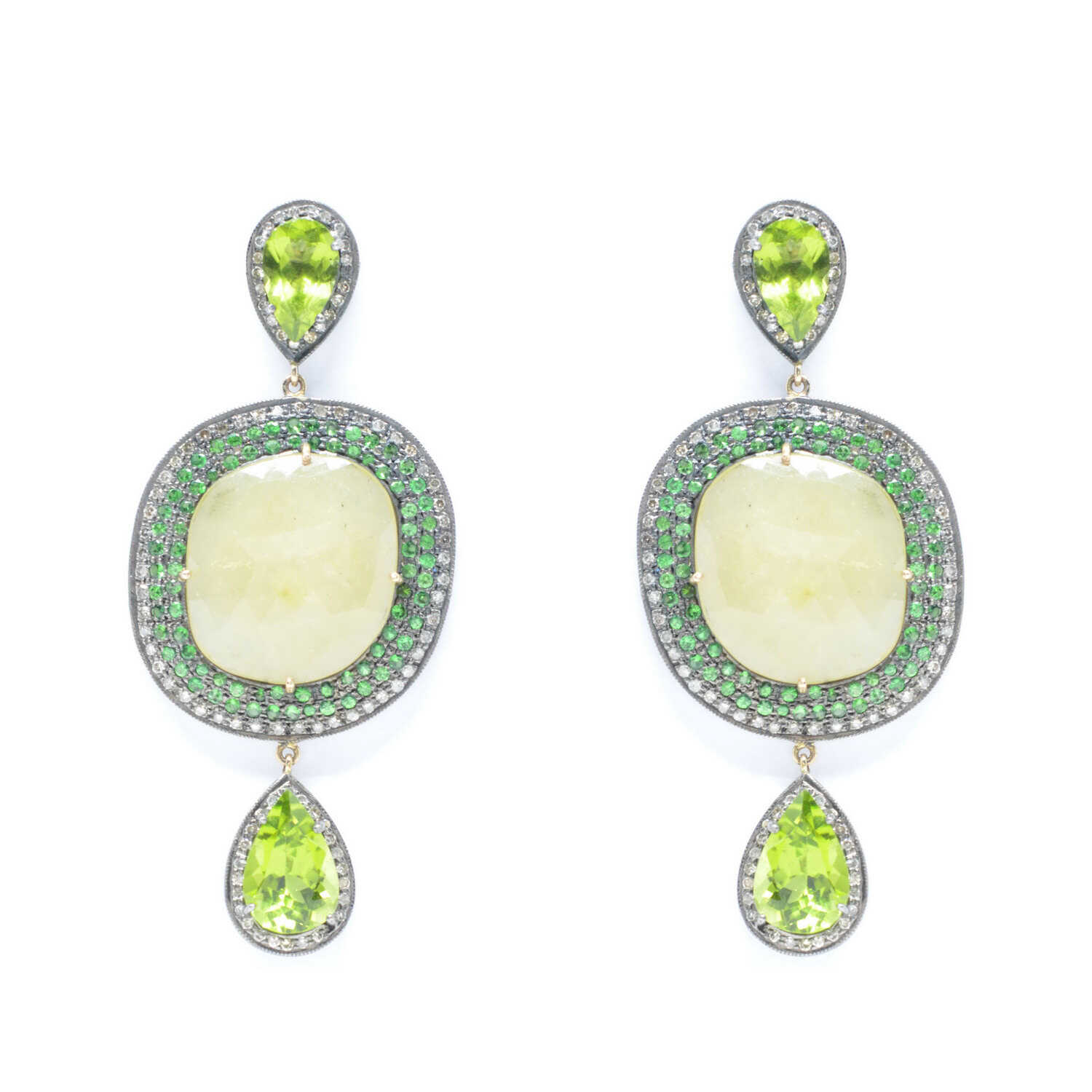 Σκουλαρίκια από χρυσό και ασήμι κρεμαστά σε εξαιρετικό art deco σχεδιασμό με πράσινα ζαφείρια , διαμάντια, τσαβορίτη και περίδοτο. Diamonds 1.39ct Peridotes 12ct Saphires 35.07ct Tsavorites 2.22ct