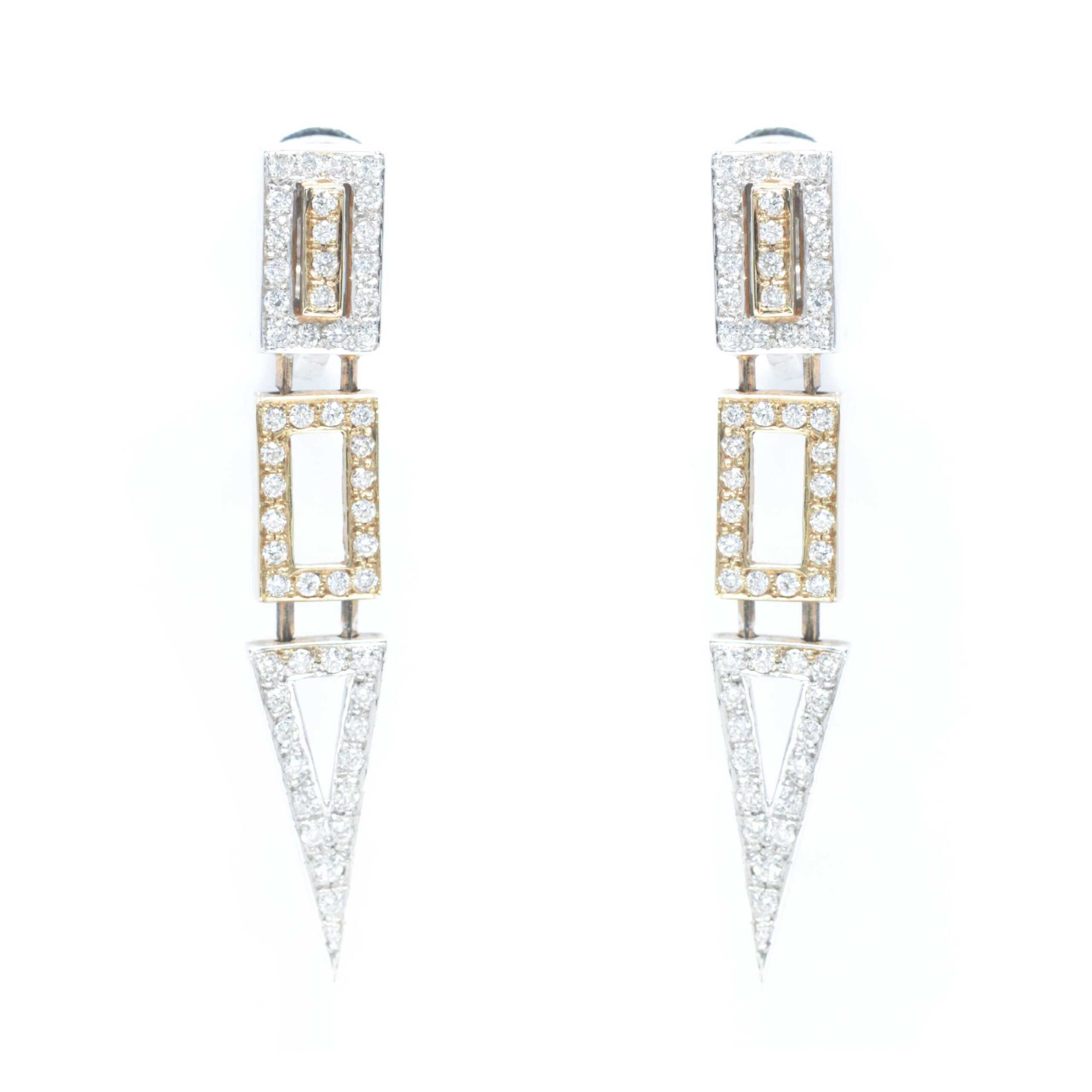 Σκουλαρίκια χρυσά κρεμαστά σε εξαιρετικό minimal σχεδιασμό με διαμάντια κοπής brilliant. Brilliants 1.29ct.