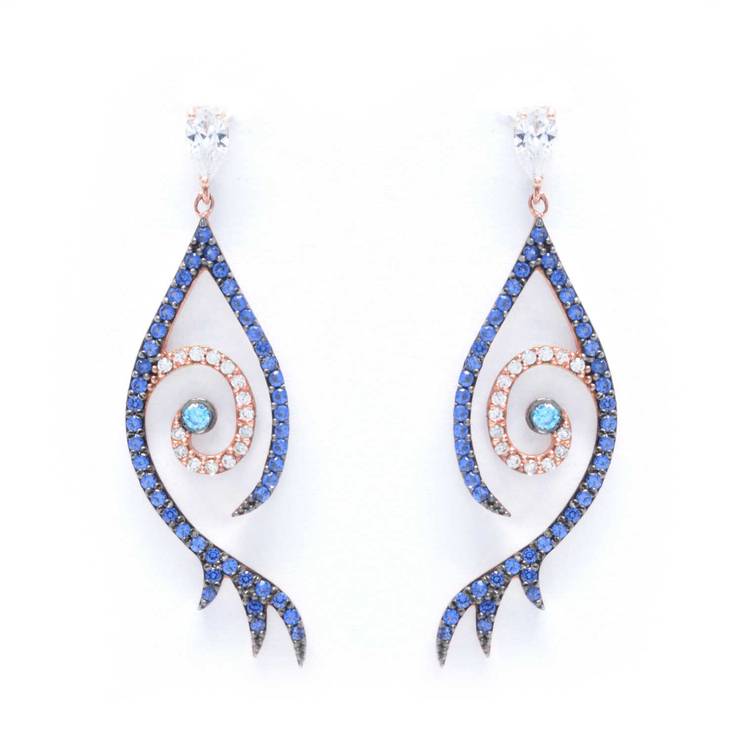 Σκουλαρίκια χρυσά κρεμαστά σε εξαιρετικό ethnik σχήμα-μάτι με λευκά και μπλε cubic zirgons