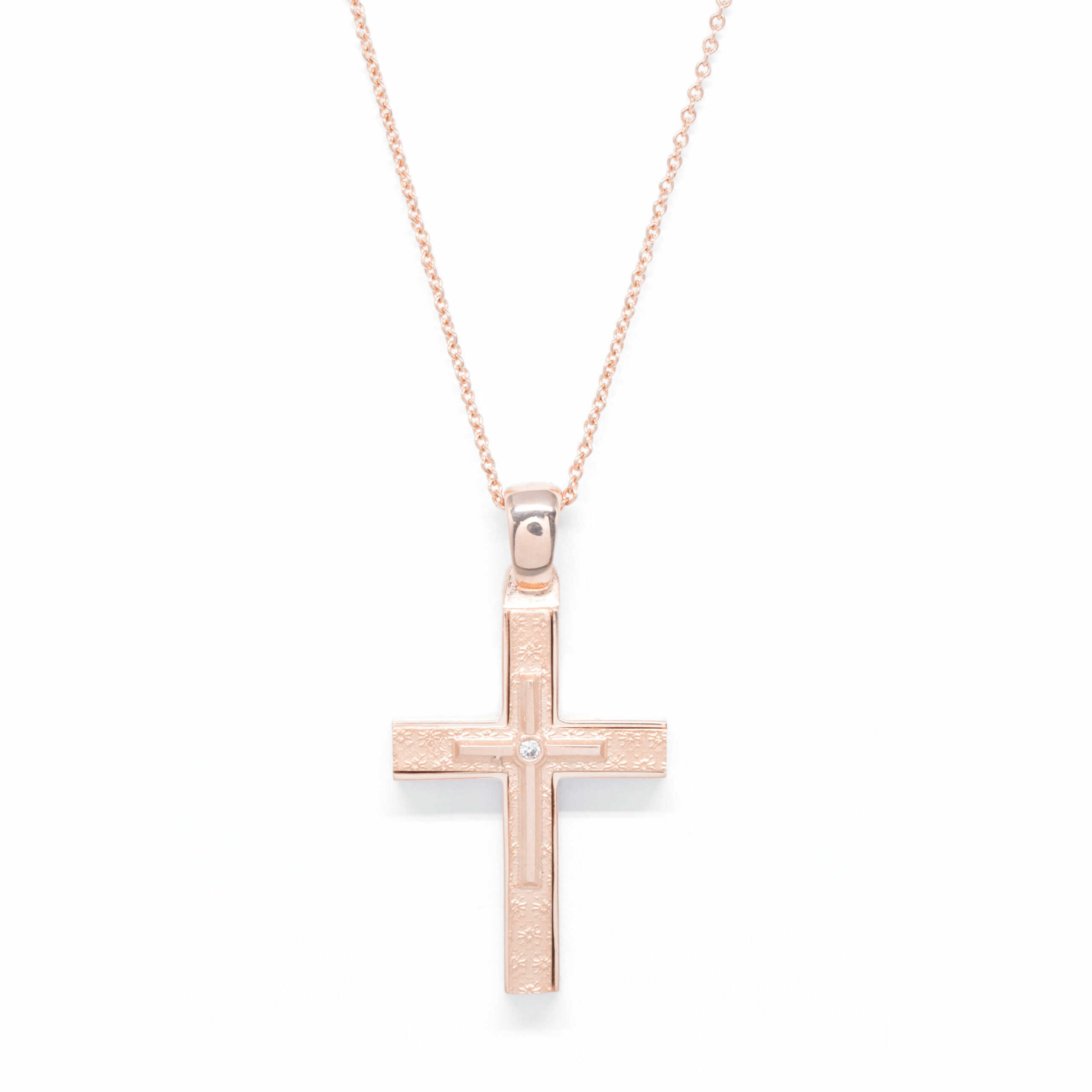 Σταυρός ροζ χρυσός ματ σατινέ και γυαλιστερός χειροποίητος με cubic zirgons σε minimal chic σχεδιασμό. Διπλής όψεως. Ιδανικός και για βαπτιστικός. .Ο σταυρός αυτός ξεχωρίζει για τη μοναδική τεχνική ΄’cross in cross’