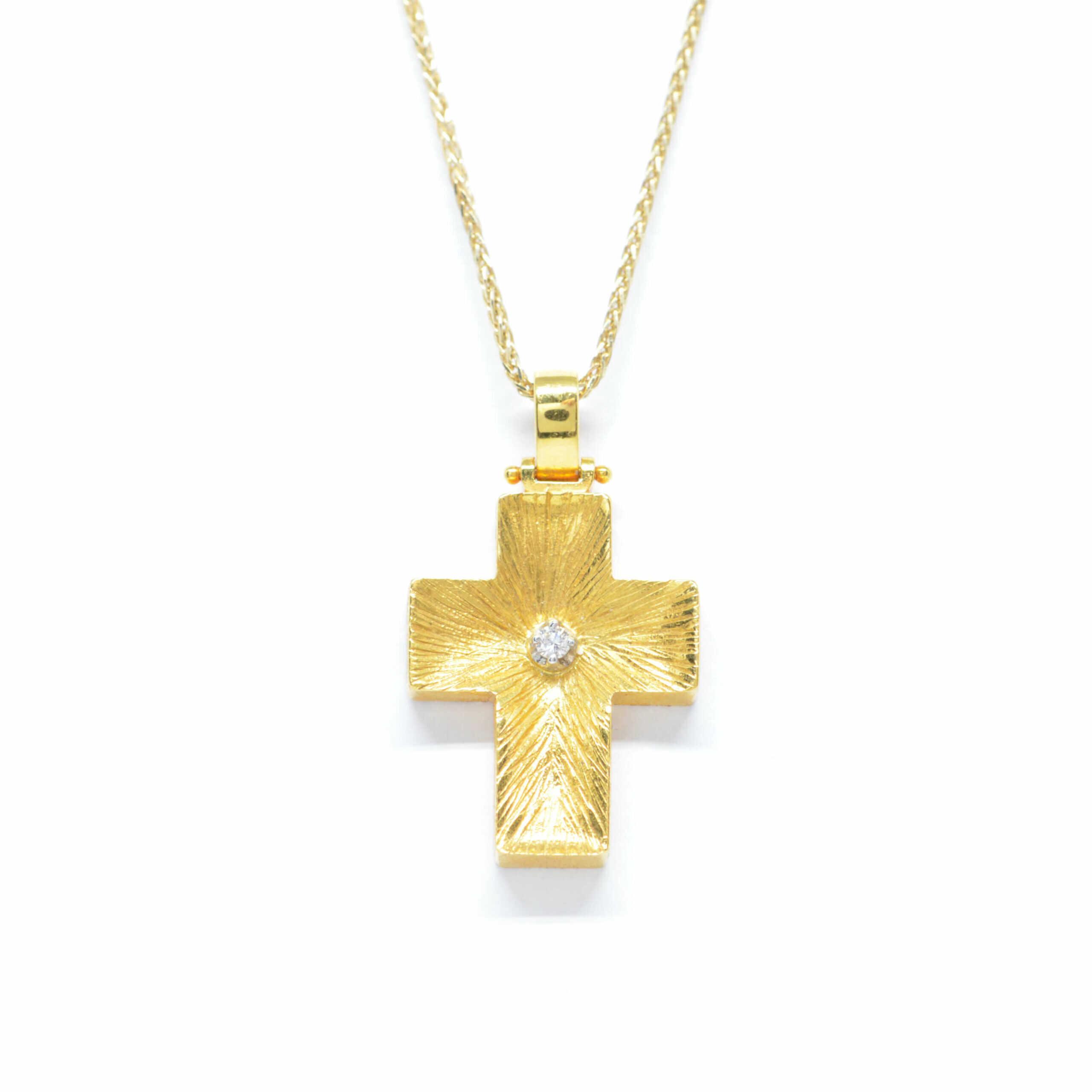 Σταυρός χρυσός ματ σατινέ χειροποίητος με σκάλισμα σε εξαιρετικό σχεδιασμό με διαμάντια κοπής brilliant.Brilliants 0,05ct. Ιδανικός και για βαπτιστικός.
