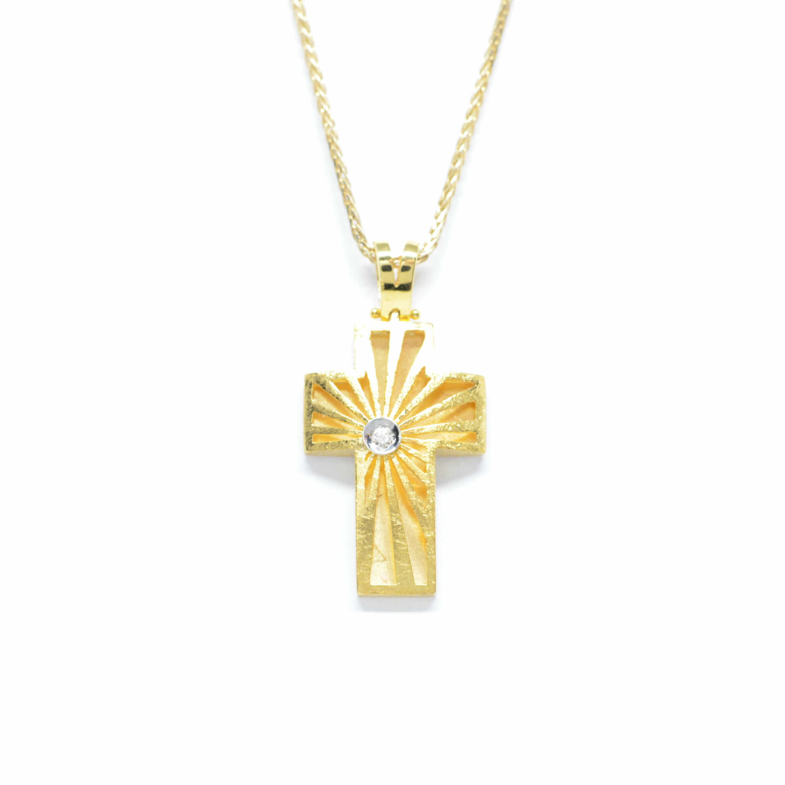 Σταυρός χρυσός ματ σατινέ χειροποίητος σε εξαιρετικό minimal σχεδιασμό με διαμάντι κοπής brilliant.Brilliant 0,03ct. Ιδανικός και για βαπτιστικός.