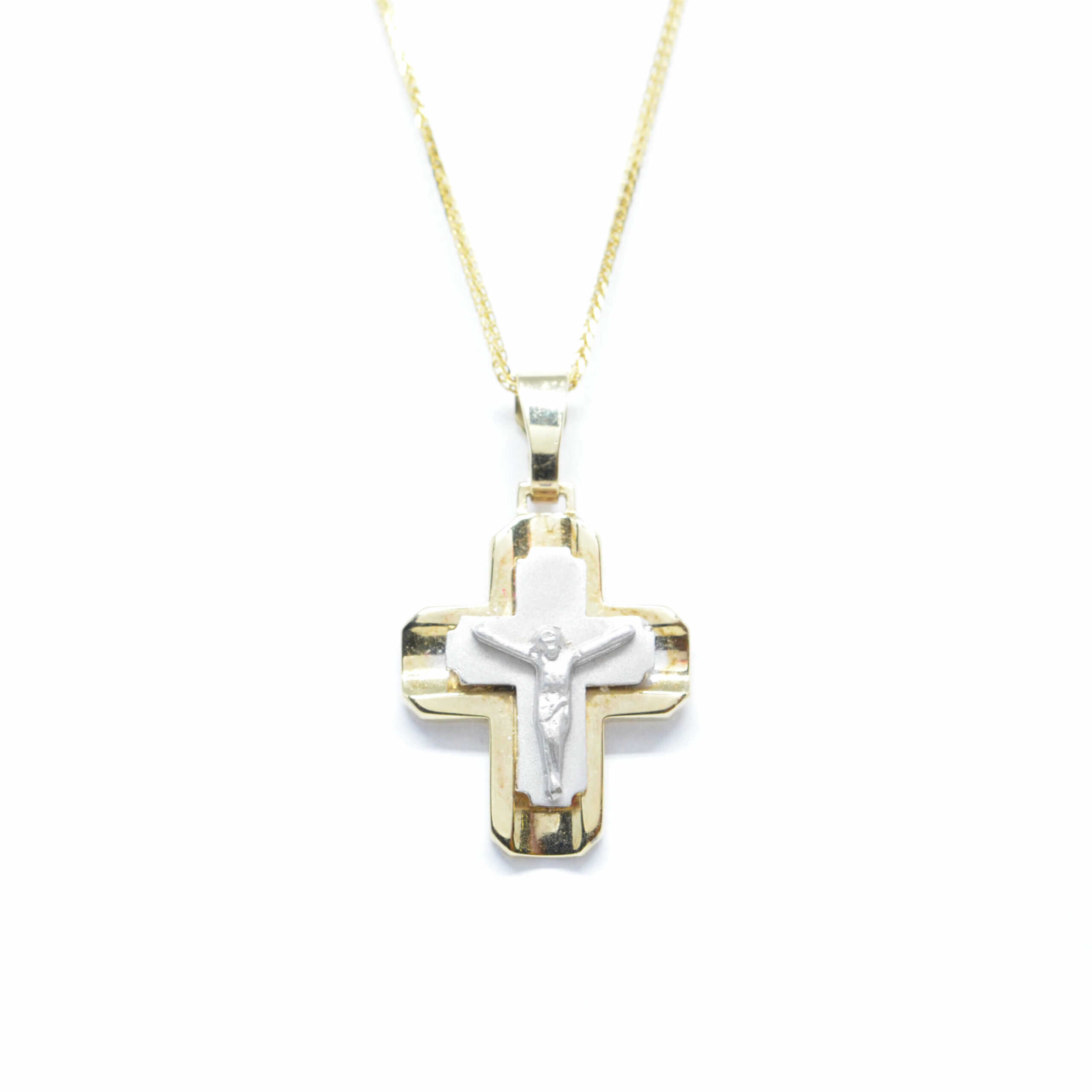 Σταυρός χρυσός ματ σατινέ χειροποίητος με διχρωμία χρυσού σε εξαιρετικό σχεδιασμό. Διπλής όψεως. Ιδανικός και για βαπτιστικός.