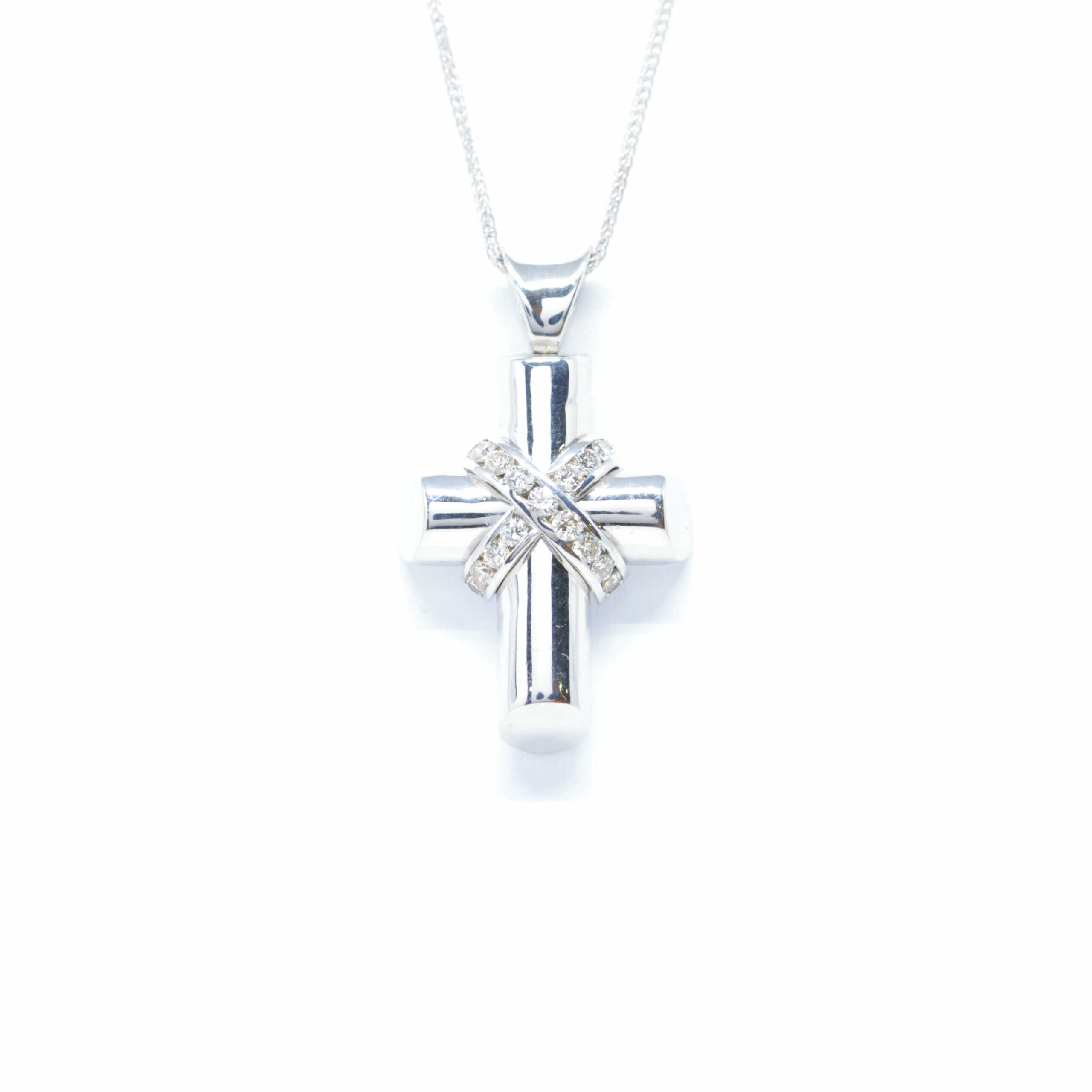 Σταυρός χρυσός γυαλιστερός σε εξαιρετικό minimal σχεδιασμό και διαμάντια κοπής brilliant. Brilliants 0.37ct. Ιδανικός και για βαπτιστικός.